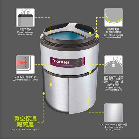 Homio Tedemei portable 2layers 1.5L leakproof inner 304 stainless steel silicone air hole student bento lunch box food container
