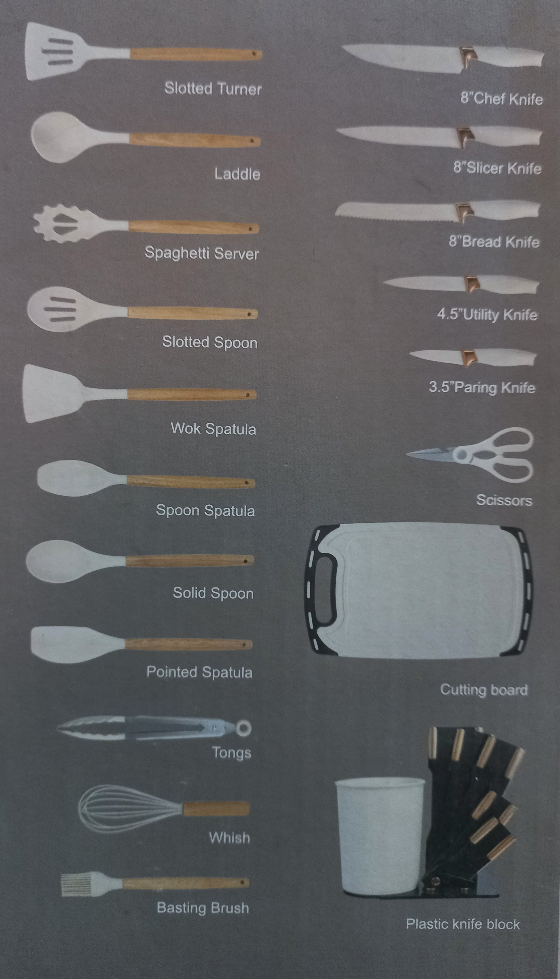 • Elevate your culinary experience with this all-inclusive 19-piece kitchen utensil and knife set, designed to bring both functionality and style to your kitchen. Crafted with high-quality materials, this set includes essential cooking tools with heat-resistant silicone heads and ergonomic wooden handles, ensuring comfort and durability. The knives, featuring sharp, wear-resistant blades, are perfect for precision cutting, while the included cutting board and utensil holder offer convenience and organization. Whether you're a seasoned chef or a home cook, this versatile set meets all your cooking needs, from prepping to serving. Its sleek design seamlessly blends with any kitchen decor, making it a practical yet stylish addition to your kitchen arsenal.