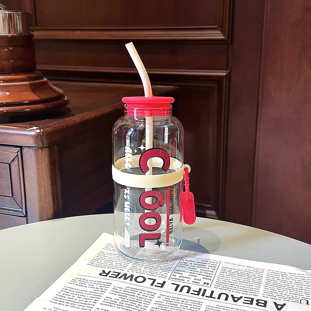2025 New Cute 730ml Mirror Glass Cup with Straw Office Household Minimalist English Glass Water Bottle